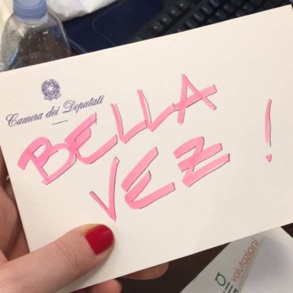 Sono brava coi bilanci, però. E tra le mille cose che ho trovato, una delle poche che ho deciso di conservare è un cartoncino della Camera con su scritto BELLA VEZ in rosa. Non ricordo di aver mai più usato un evidenziatore rosa in vita mia.